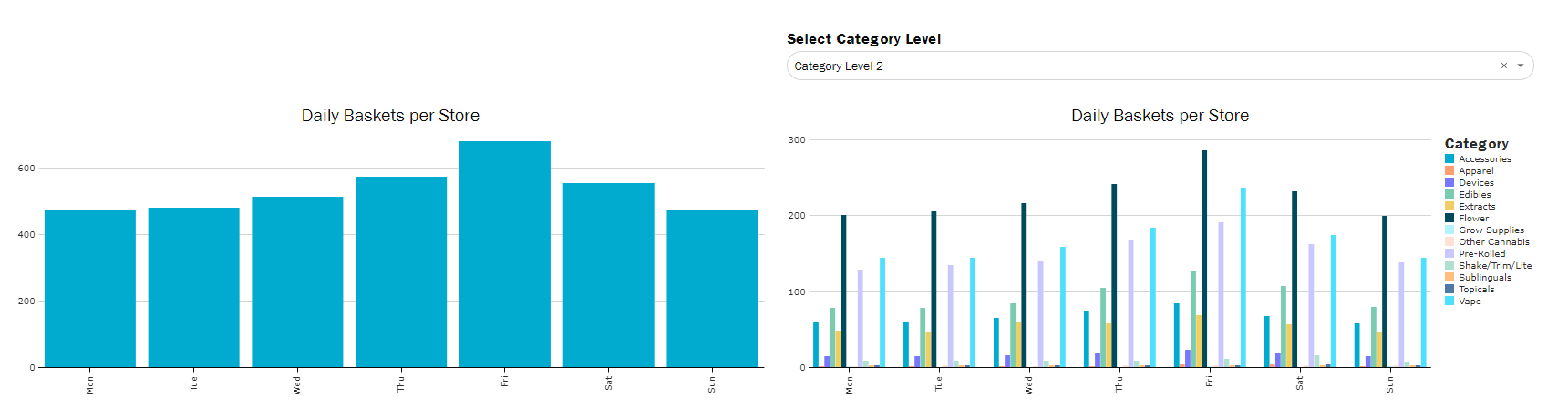 Track the total number of baskets by each day as well as the category makeup across days of the week.