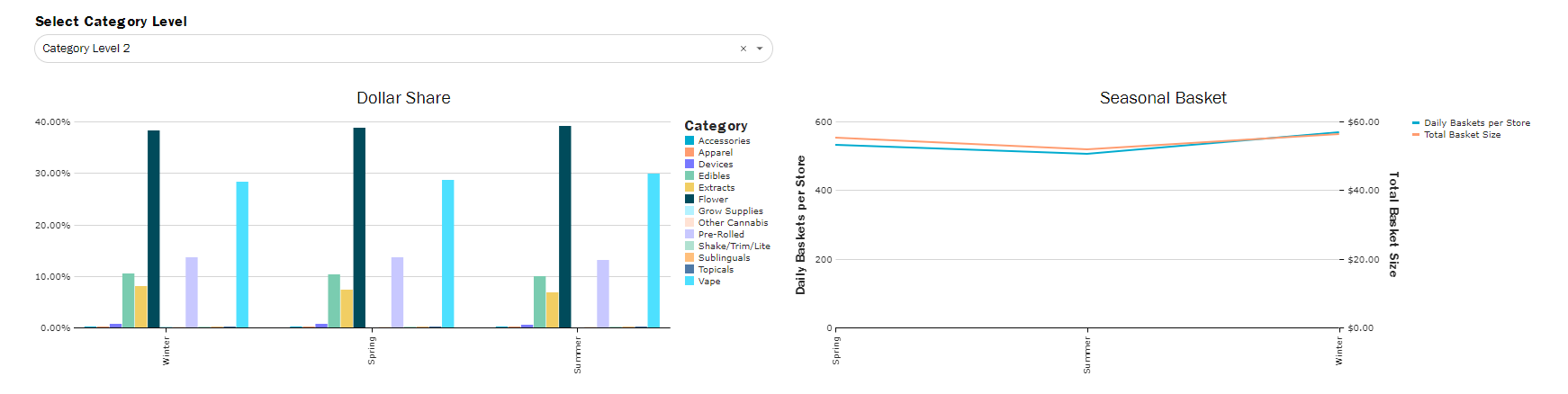 Follow which categories sell most across different seasons, as well as which season drives the highest number of transactions and amount spent.