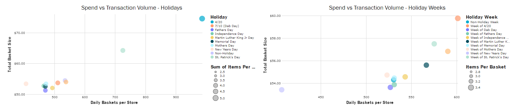 Use these scatterplots to track basket performance on holidays and holiday weeks vs non-holidays.