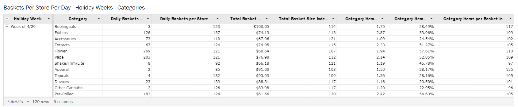 The final widget in this dashboard is a table that looks at each category selling that holiday week, basket size, daily baskets per store, and items per basket, and then compares them to non-holiday weeks using an index.