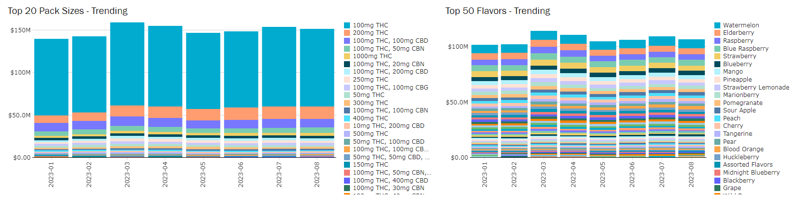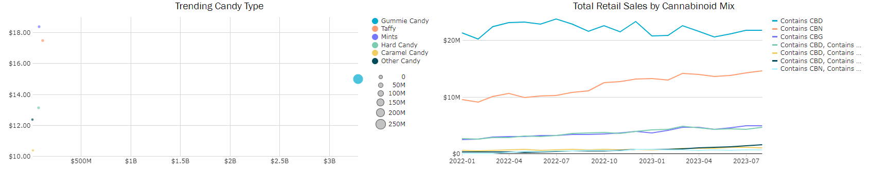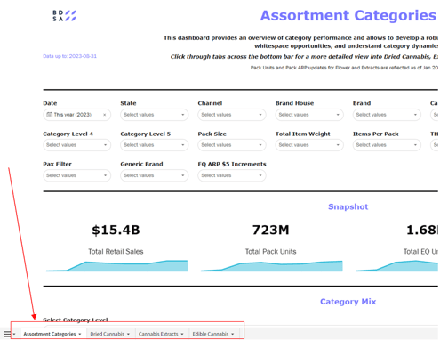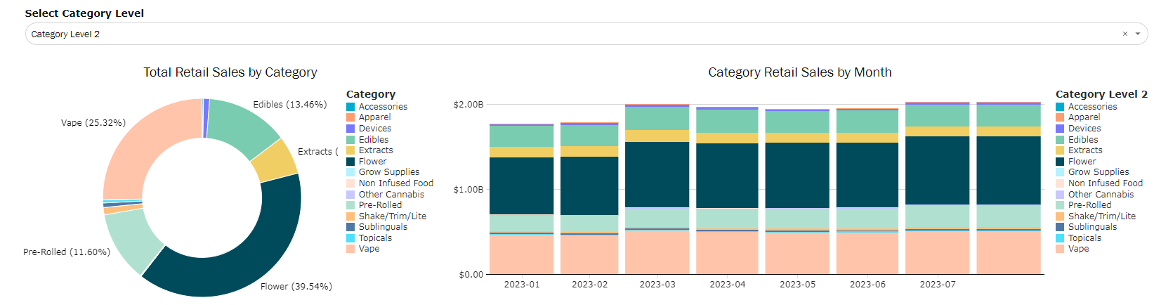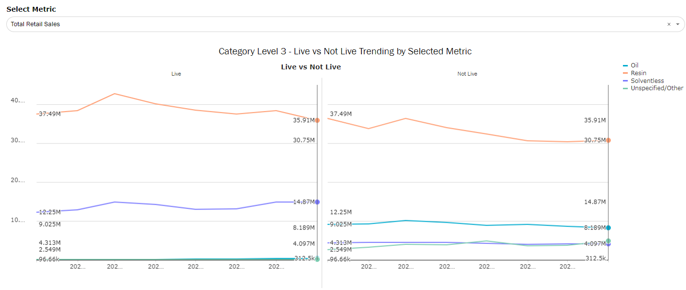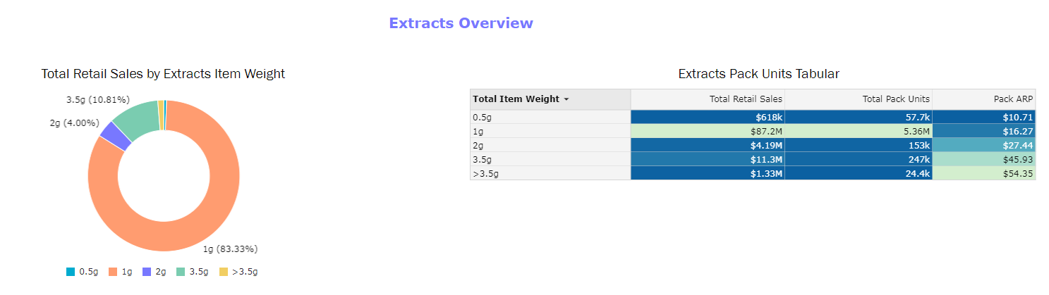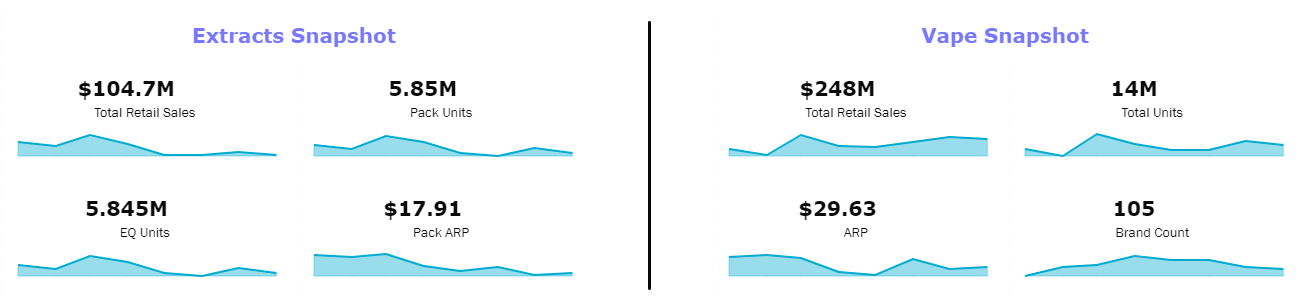 Designed to focus on attributes specific to Extracts and Vapes. Note that all filters will be reflective of this specific set of data. This dashboard can be used to track attribute trends in a market, identify innovation opportunities, and gauge what is driving total revenue across attribute types.
