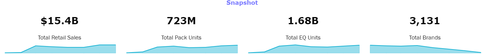 - Compare share of pack size and flavor to understand very granular popularity in a market, or filter to a brand and understand how a brand's assortment compares to overall market trends.