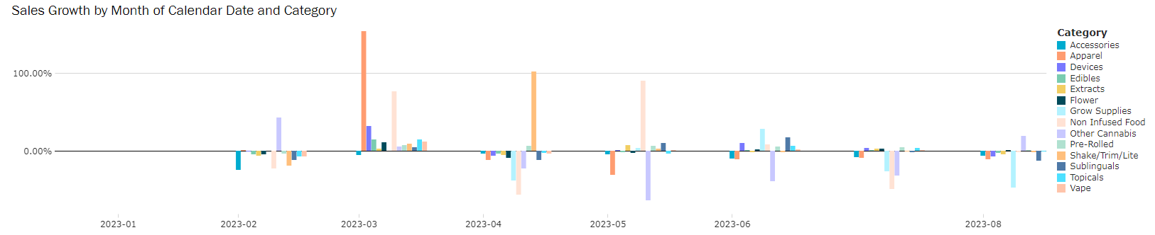 Complete the trending category story by looking at month to month category growth and decline over a chosen time period.