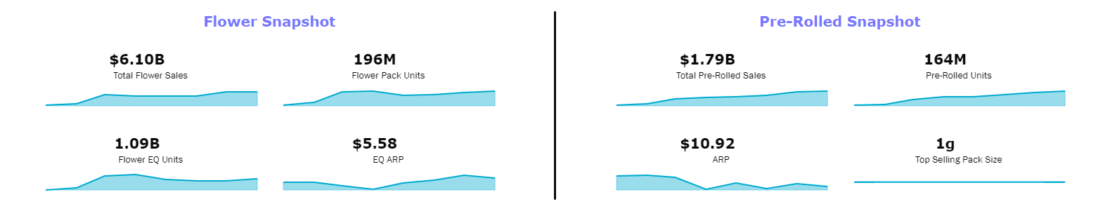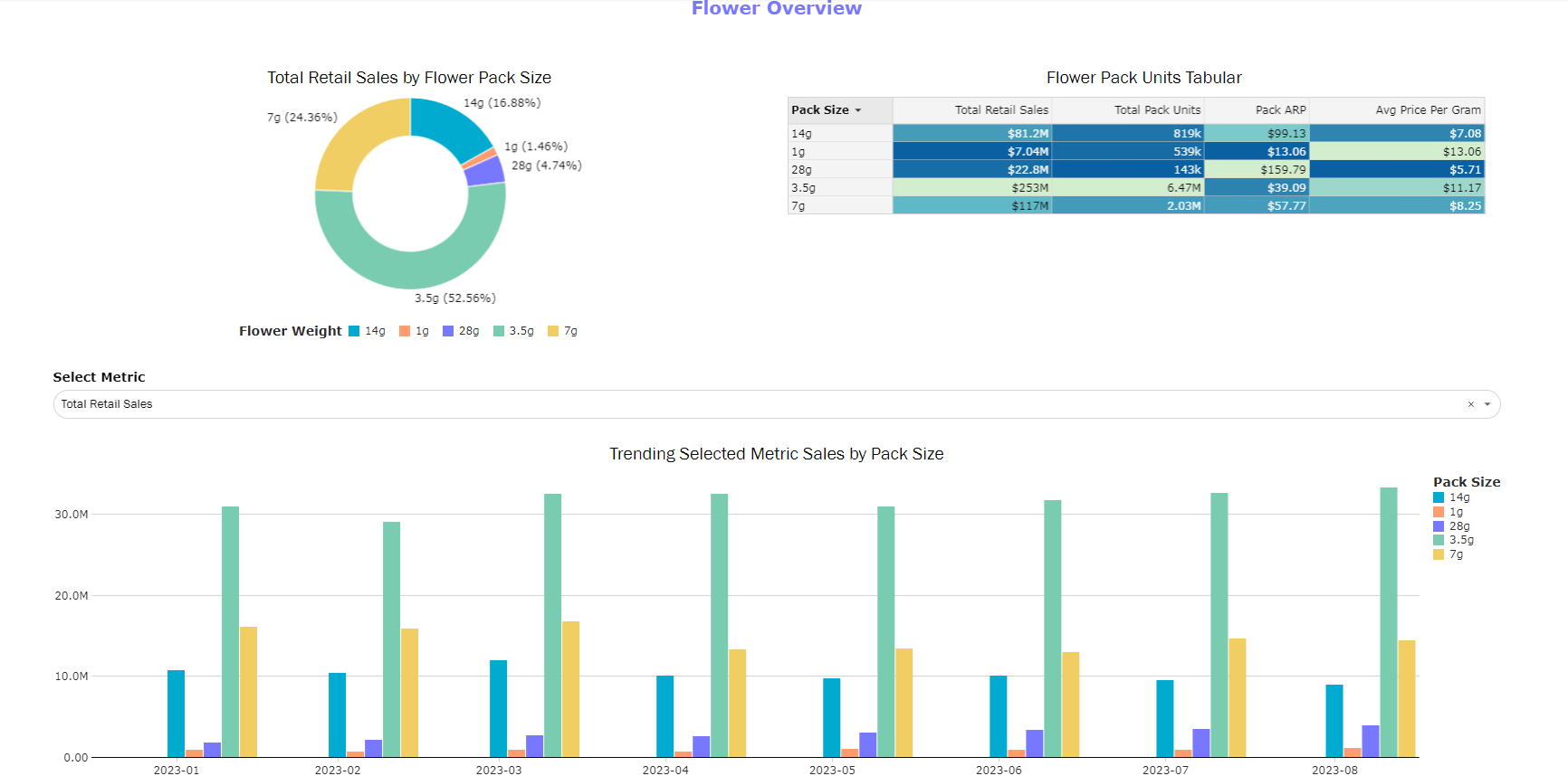 Designed to focus on attributes specific to Flower and Pre-Rolls. Note that all filters will be reflective of this specific set of data. This dashboard can be used to track attribute trends in a market, identify innovation opportunities, and gauge what is driving total revenue across attribute types.