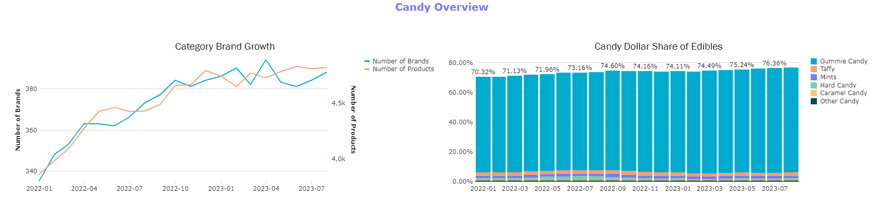 - Track the expansion of the category over time looking at the increase in the number of brands and products in the category.