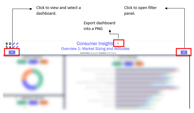 - Use the buttons across the top panel to filter the current dashboard to a specific region, demographic, user type, etc. (top right button), navigate to a new dashboard (top left button), or download to a PNG (center button).