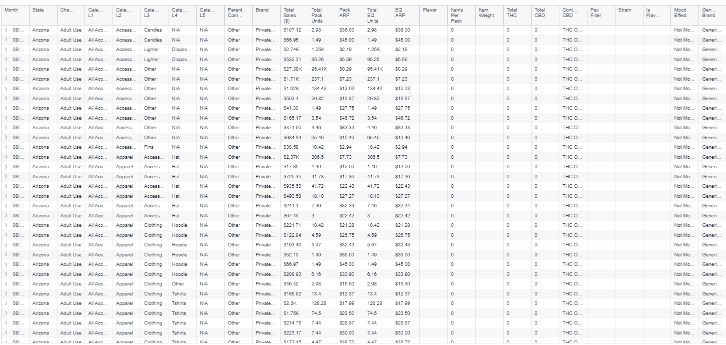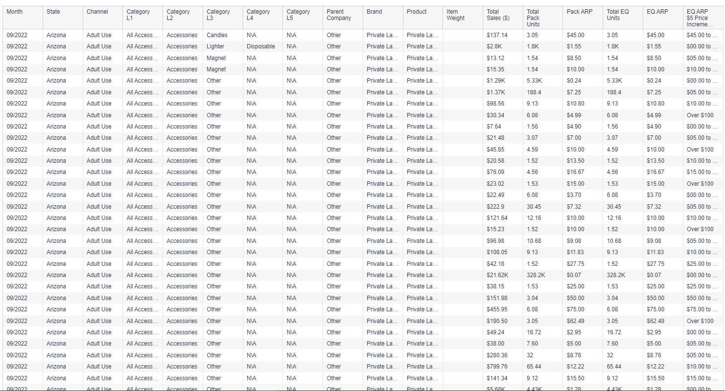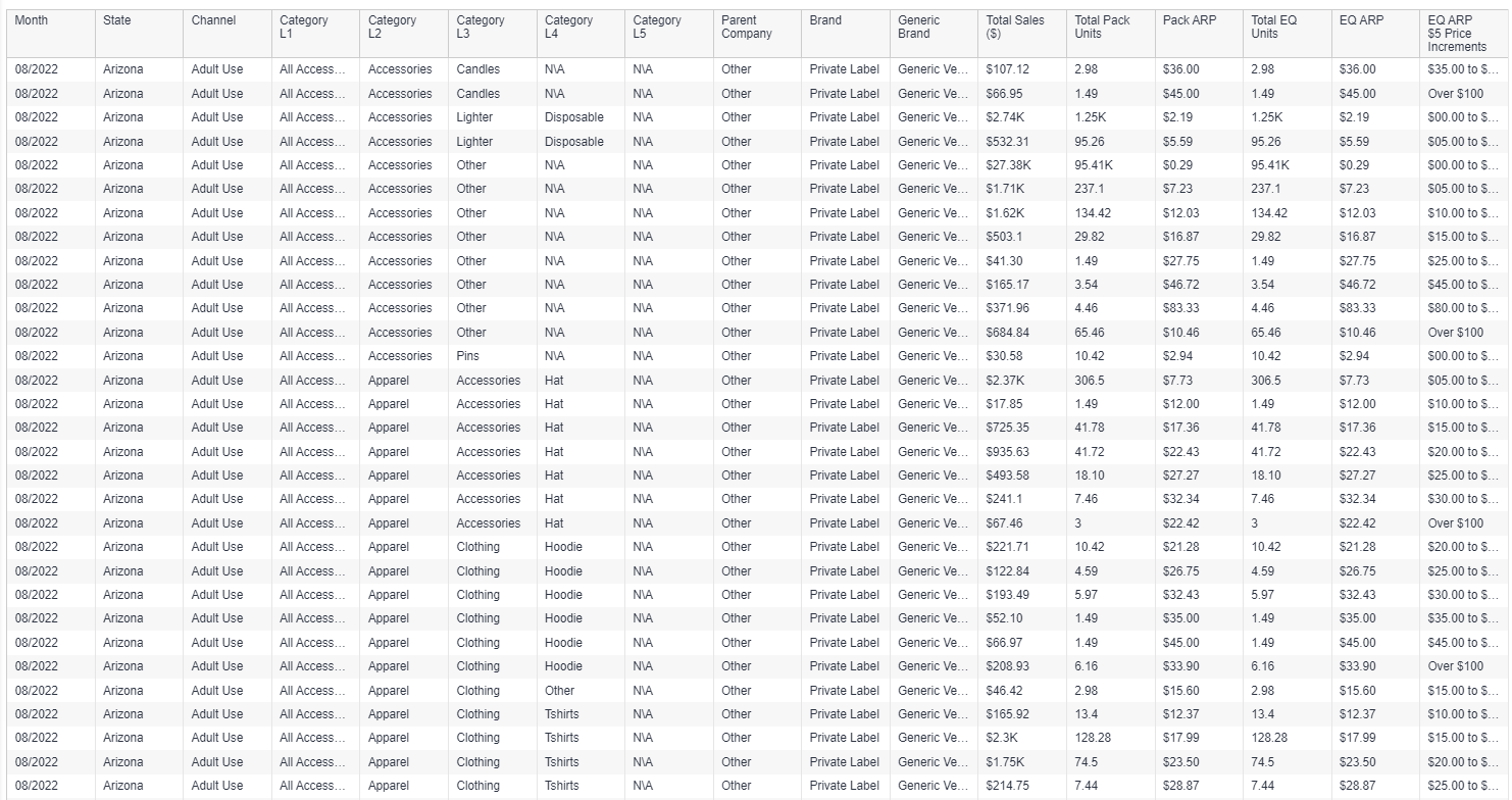 Category, brand, and product level tables in an easily downloadable format.