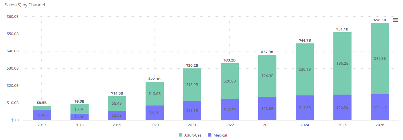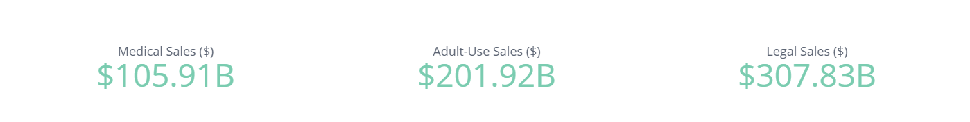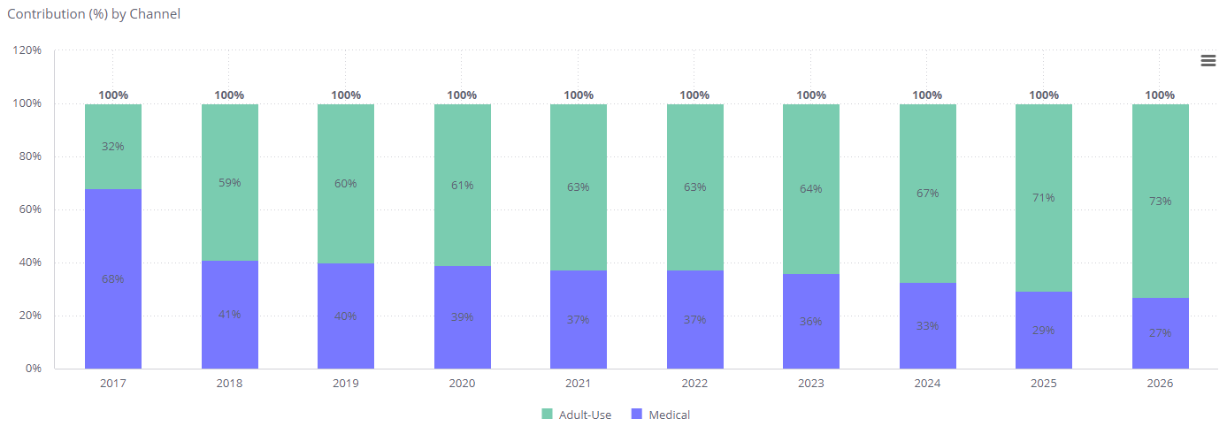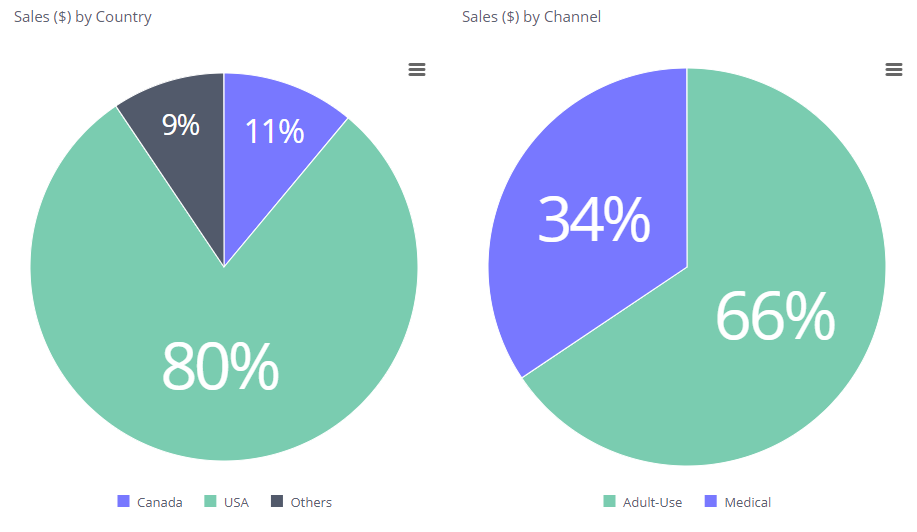 Compare the global share of cannabis sales by country, as well as comparing the % of sales that are attributed to Medical vs Adult Use.