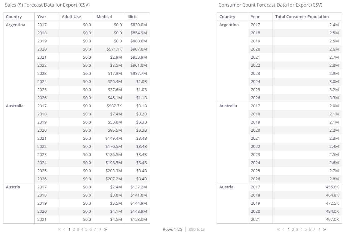 Exportable tables for internal investigation and analysis. Evaluate trends across legal and illicit channels, as well as the total population consuming.