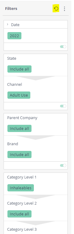 The filter bar on the right side of each page will allow you to apply filters to the entire view. Green filter blocks show what is included in the data; red filter blocks indicate what is omitted from the data. Click on the circular arrow at the top of the filters bar to reset. Filter settings are not saved from page to page.