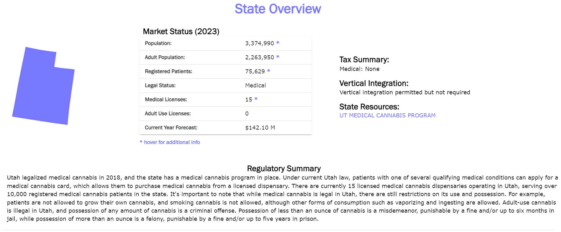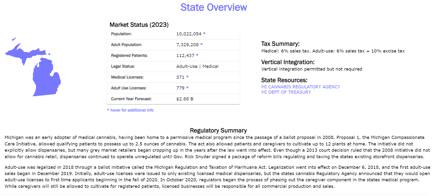 State overview provides high-level insight into population, sales, licenses, and regulations across the state. All data is refreshed quarterly, along with Market Forecasts.