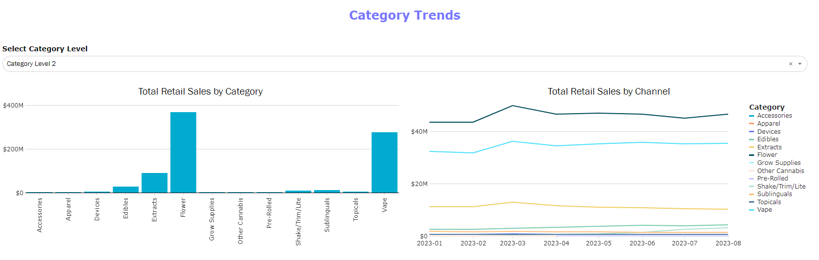 - Use the category level drop down to change the level of the category hierarchy reflected in the visuals.
