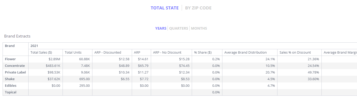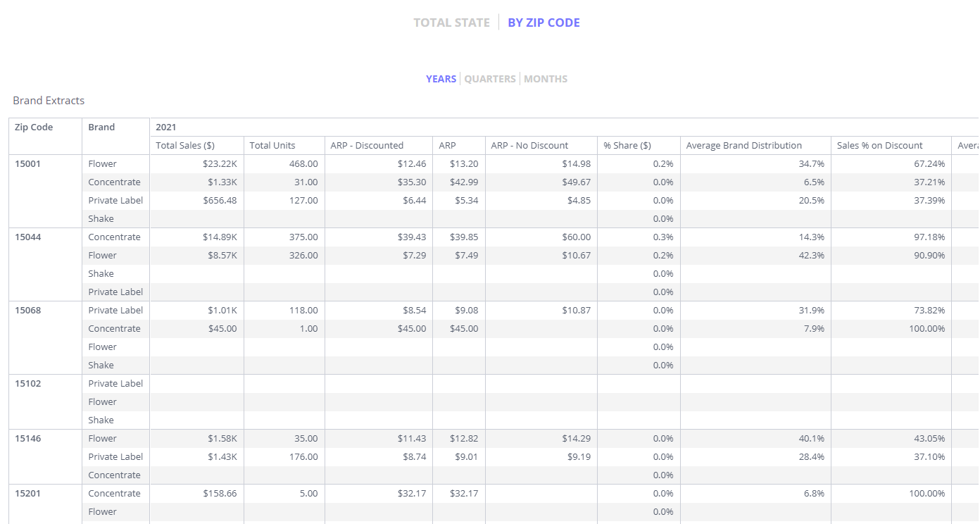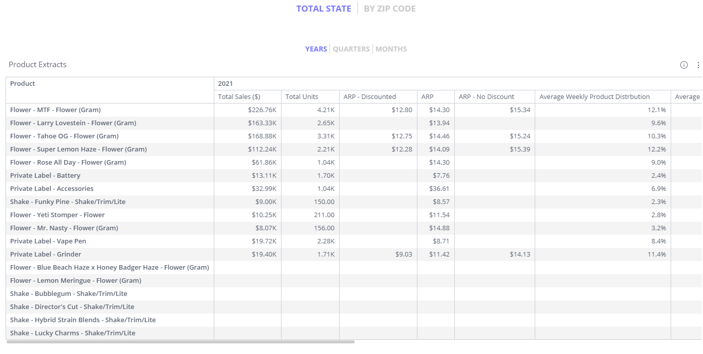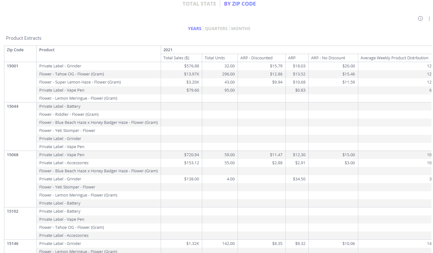 A list of main KPIs for all products broken out by zip code. Customize the table by choosing time periods broken out as well as if the table should be broken out by zip code or total state.