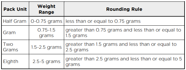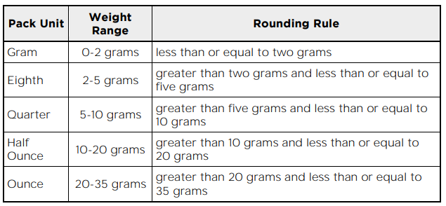 A Flower Pack Unit includes either a Gram, Eighth, Quarter, Half Ounce, or Ounce. Any packaged unit sold with a weight that is not exactly 1 gram, 3.5 grams, 7 grams, 14 grams, or 28 grams is rounded according to the below table.