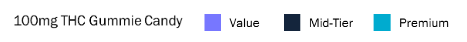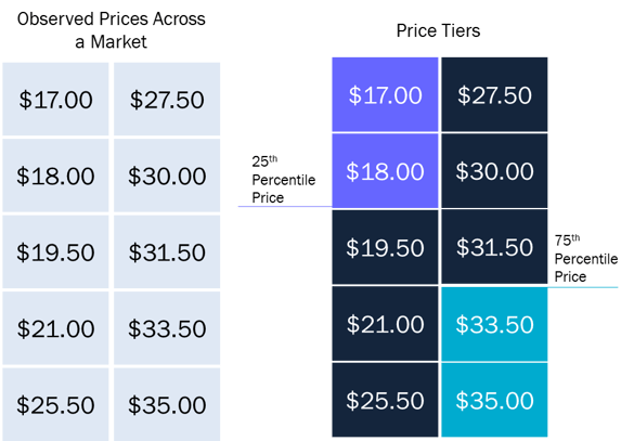 Below is an example of how tiering is determined. Each price represents a different SKU within a product grouping (100mg THC Gummie Candy) in the same market and month. These prices are them broken out into percentiles.