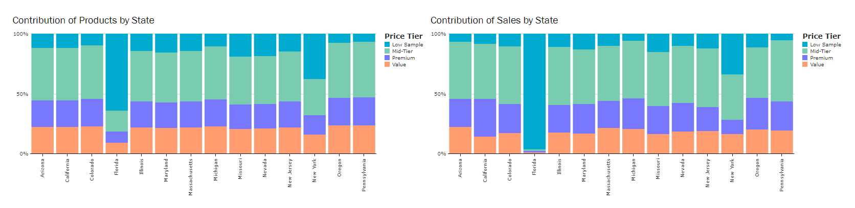 - Price Tier Breakouts displays contribution of SKUs and contribution of dollar sales by state. Contribution of Products looks at the total number of products per state and breaks out the percent of products that fall into each price tier.
