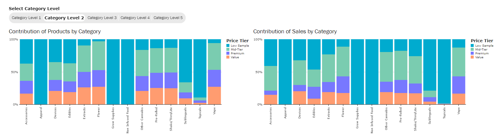 - Contribution of Products visual looks at the total number of products per category and breaks out the percent of products that fall into each price tier.