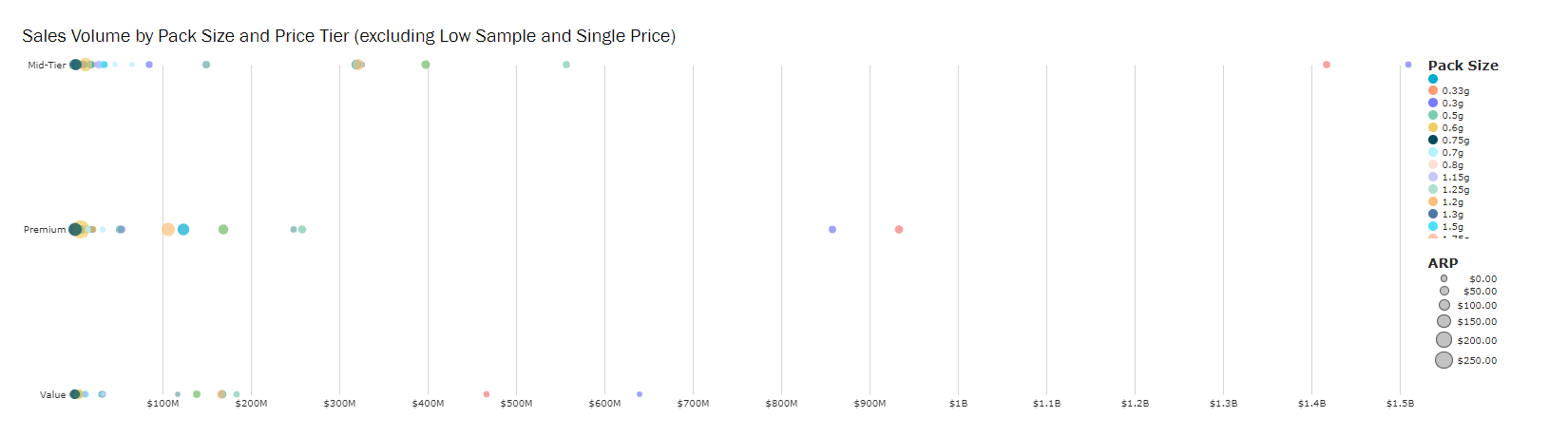 - Dot placement is based on total sales of the pack size by tier, sized by ARP.