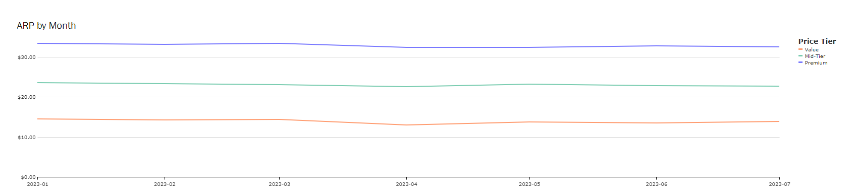 Use the snapshots across to the top to see the ARP by tier for the most recent month selected in the date filter and how it has changes from the previous month.