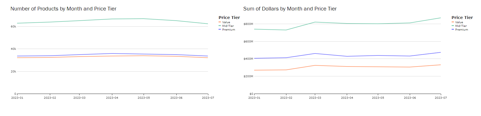 - Use filters to understand how sales have changes by price tier overtime by category, brand, or state.