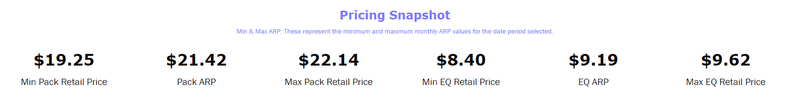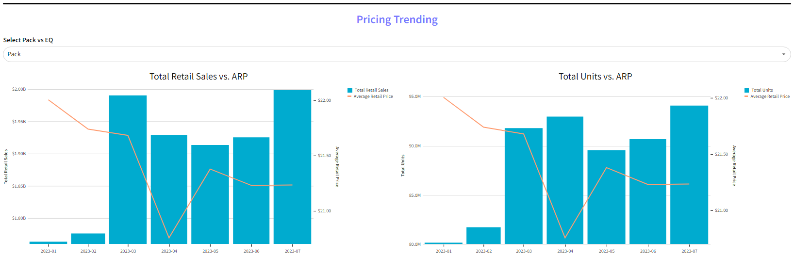Trending retail sales or units vs. ARP. Use the selector to view Pack or EQ ARP.