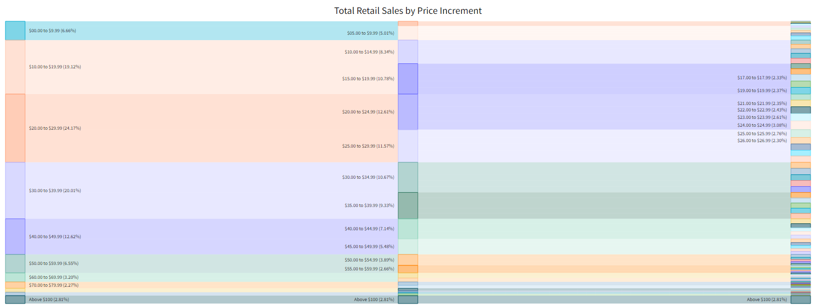 View total retail sales and share by various price increment levels ($10, $5, and $1 increments). The sizes of each section relate to total retail sales within that price increment.