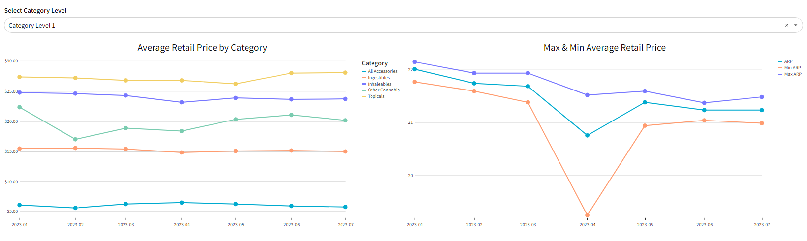 Trending price by category and an overall market view of minimum, maximum, and average retail prices.