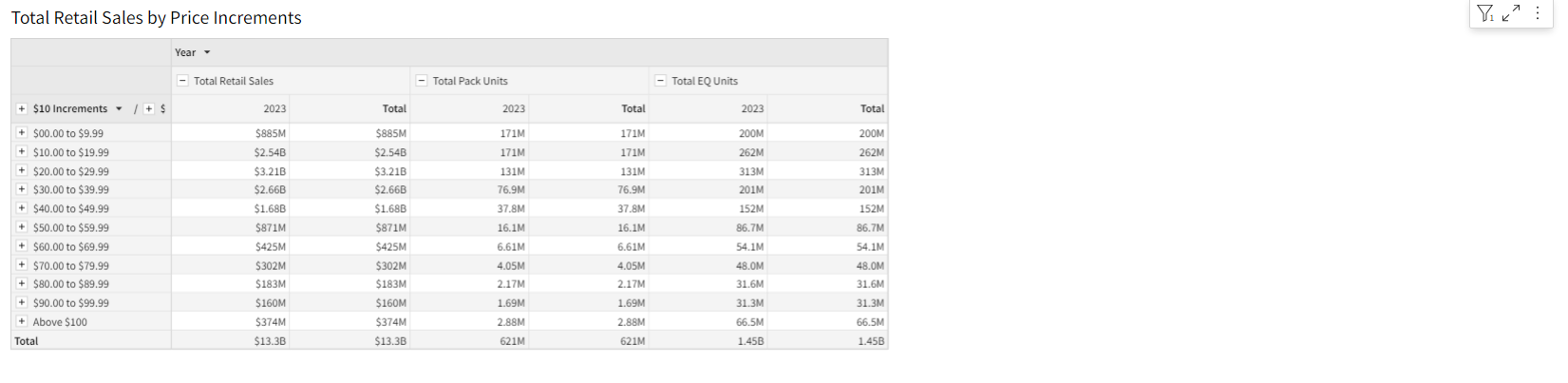 Get trending granularity into total retail sales by price increment. Click the plus icon to expand into more granular price increments.