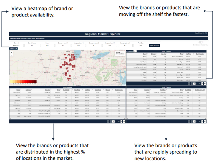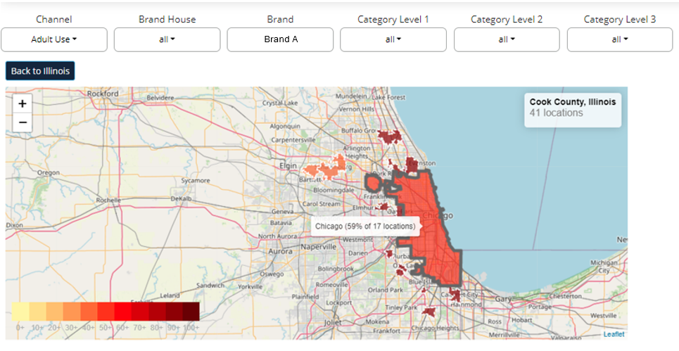 For example, setting the Brand filter to Brand A and hovering over Chicago tells us that 59% of the 17 Adult Use locations in Chicago sell Brand A products.
