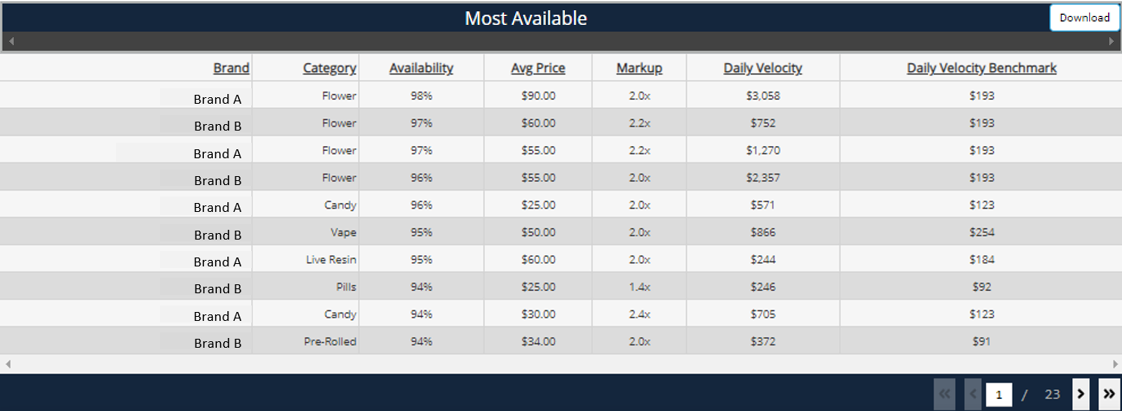 Toggle to Brand view to include the Daily Velocity Benchmark within the Most Available table.