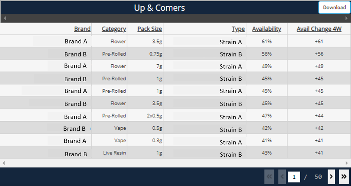 The Up & Comers table tracks changes in a product or brand's availability over the last four weeks.