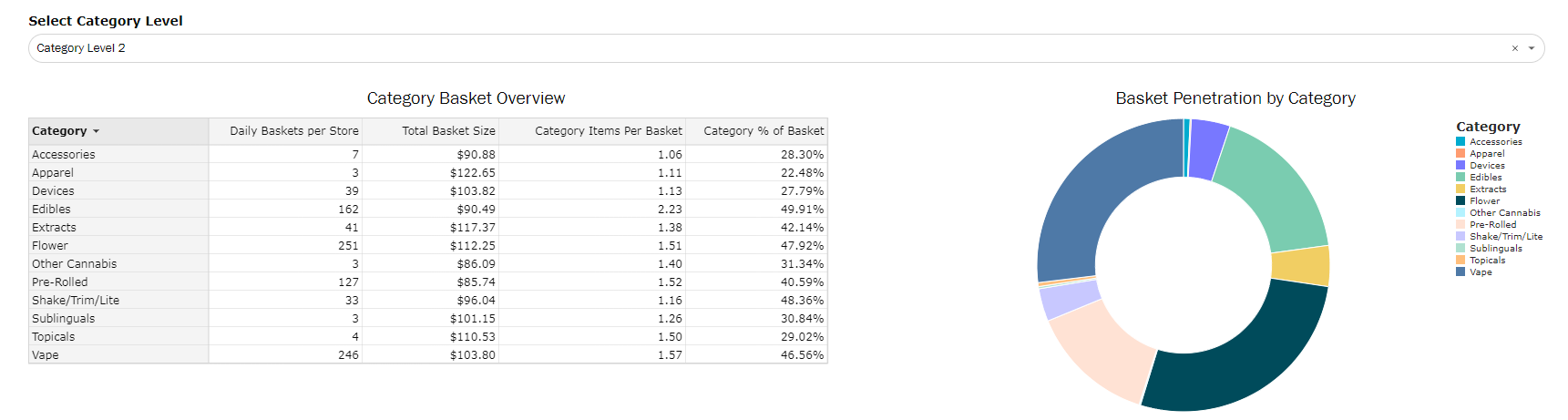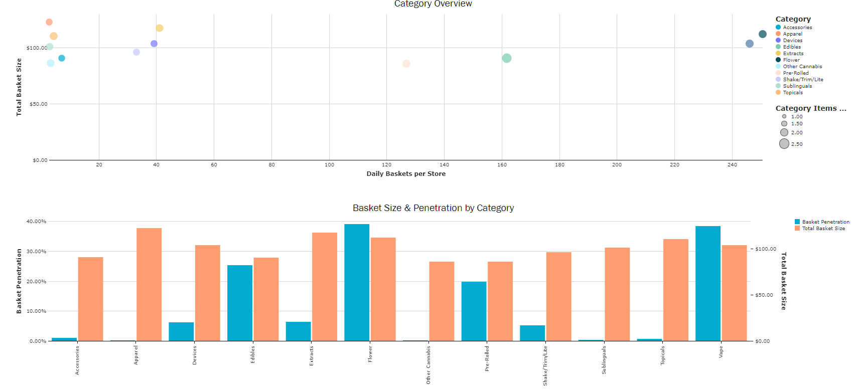 - Compare which categories bring in the largest basket size vs number of baskets using Category Overview.