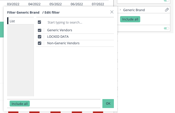 - Recommendation: When conducting category-level analysis, "Include All" for the Generic Brand filter to ensure you are representing the full volume of sales. When analyzing for top-selling brands and products, select Non-Generic Vendors only from the filter options.